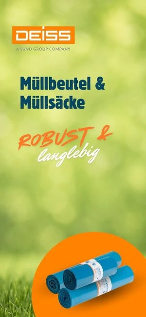 Müllbeutel & Müllsäcke von Deiss sind in unterschiedlichen Größen und Materialstärken erhältlich. Sie eignen sich für die sichere Entsorgung von Haus-, Verpackungs- oder Biomüll ebenso wie für hygienisch sensible Abfälle in medizinischen oder gastronomischen Bereichen. Dank ihrer hohen Reißfestigkeit bleiben sie selbst bei hohem Füllvolumen stabil und zuverlässig dicht.